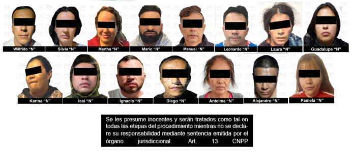 Las personas imputadas, identificadas como Karina “N”, Pamela “N”, Guadalupe “N”, Antelma “N”, Silvia “N”, Laura “N”, Martha “N”, Alejandro “N”, Manuel “N”, Wilfrido “N”, Diego “N”, Leonardo “N”, Isaí “N”, Ignacio “N” y Mario “N”, fueron detenidas tras un operativo coordinado del Gabinete de Seguridad del Gobierno de México, en el que participaron la Secretaría de Seguridad y Protección Ciudadana (SSPC), la Secretaría de Marina (Semar), la Secretaría de la Defensa Nacional (Defensa), la Guardia Nacional y la propia FGR.
